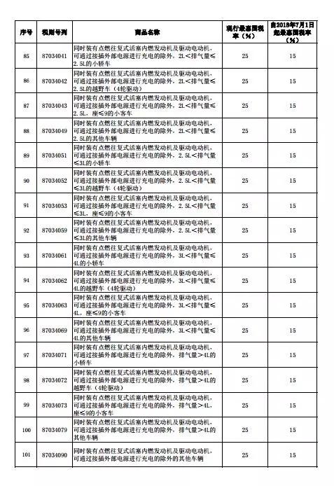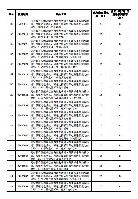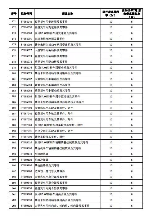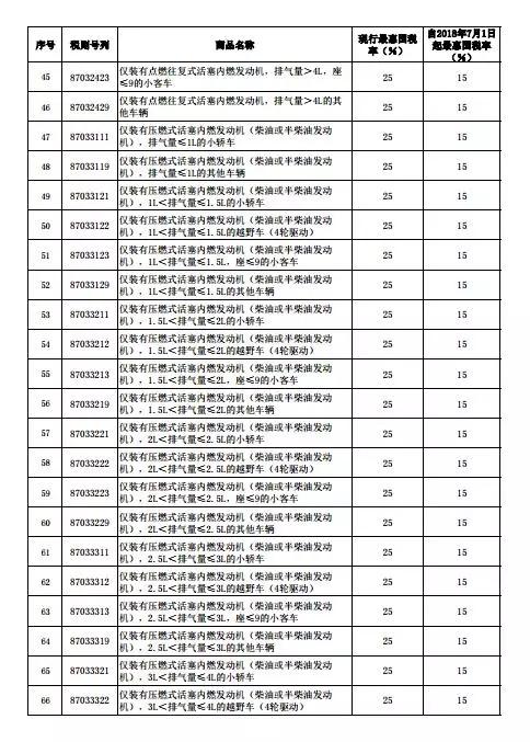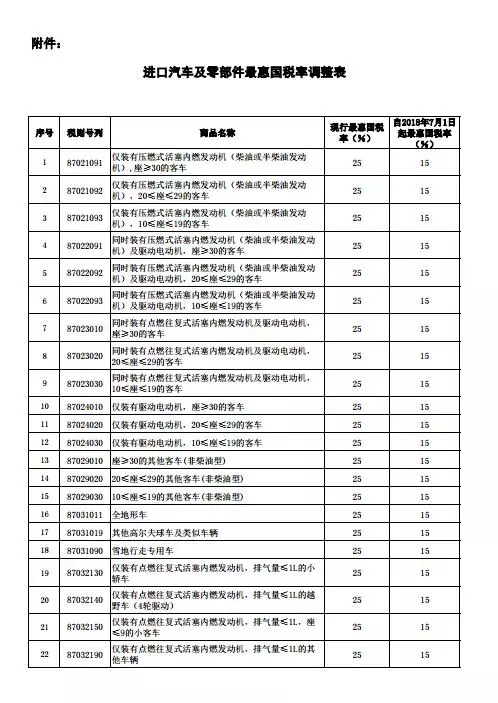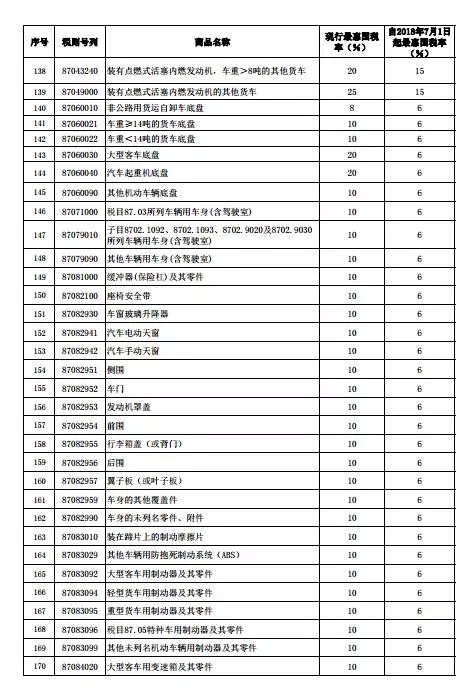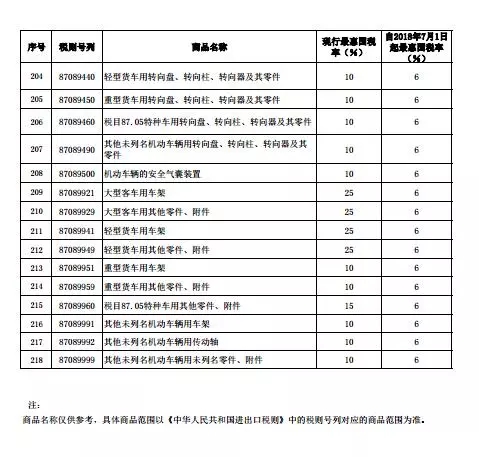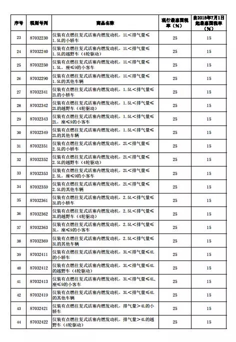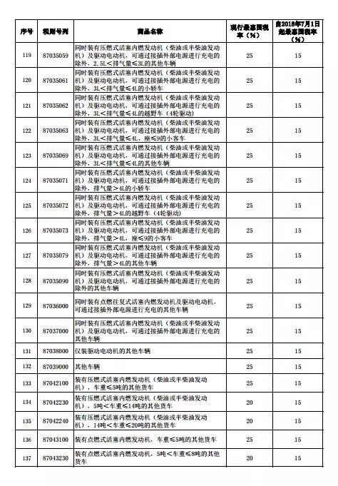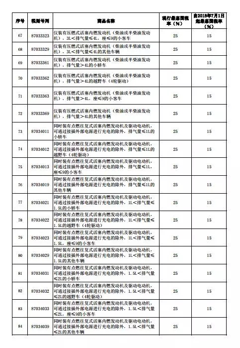 为进一步扩大改革开放,推动供给侧结构性改革,促进汽车产业转型升级,满足人民群众消费需求,自2018年7月1日起,降低汽车整车及零部件进口关税。将汽车整车税率为25%的135个税号和税率为20%的4个税号的税率降至15%,将汽车零部件税率分别为8%、10%、15%、20%、25%的共79个税号的税率降至6%。具体税目及税率调整情况见附件。